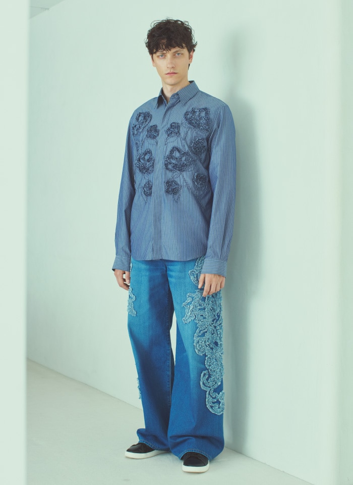 シャツ、デニムパンツともに、共生地を使った立体的な刺しゅうによる、彫刻のような精緻な陰影が特長。春らしいユニークなアイテムでありつつも、シャツ、デニムパンツともにシンプルなシルエットなので、どんなコーディネートにも取り入れやすいアイテムです。