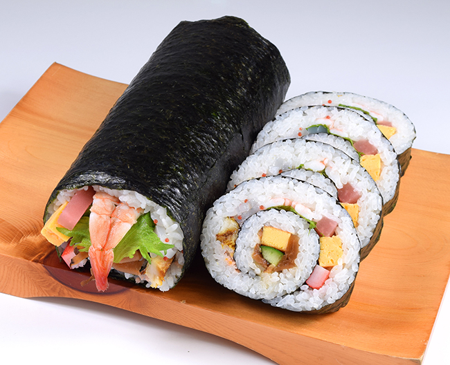 海老や穴子・花咲いかなど12種類の具材を巻いた、一口ごとに違う味がお楽しみいただける極太巻です。