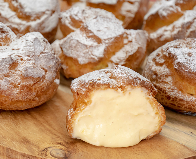 神戸・元町の〈エストローヤル〉から、シュー・ア・ラ・クレームを高島屋限定で実演販売いたします。店内厨房でサクッと焼きあげたシュー生地の中には、芳醇なバニラビーンズがたっぷり。