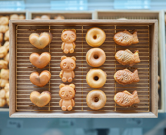 水を使わずに練り上げた生地を、一口サイズのドーナツ、たい焼き、パンダの形に仕上げました。ほんのりと優しい甘さです。豊富な味のバリエーションをお楽しみください。