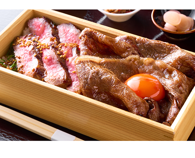 ↑〈滋賀・寛閑観〉近江牛極上霜降りすき焼き&ステーキハーフ重(1人前) 4,400円