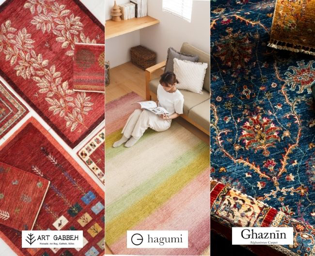 草木染めの糸を使い、丁寧に織られた南ペルシャの「アートギャベ」。日本の四季をイメージした「ハグみじゅうたん」。伝統的な美しい文様の「ガズニン」。3種類の手織り絨毯のぬくもりをぜひご体感ください。