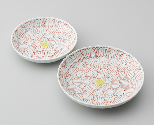↑(写真左)錦牡丹菊型4.5寸皿(約径14.0×高さ3.0cm) 8,250円 / (写真右)錦牡丹菊型5.5寸皿(約径17.0×高さ3.7cm) 9,350円