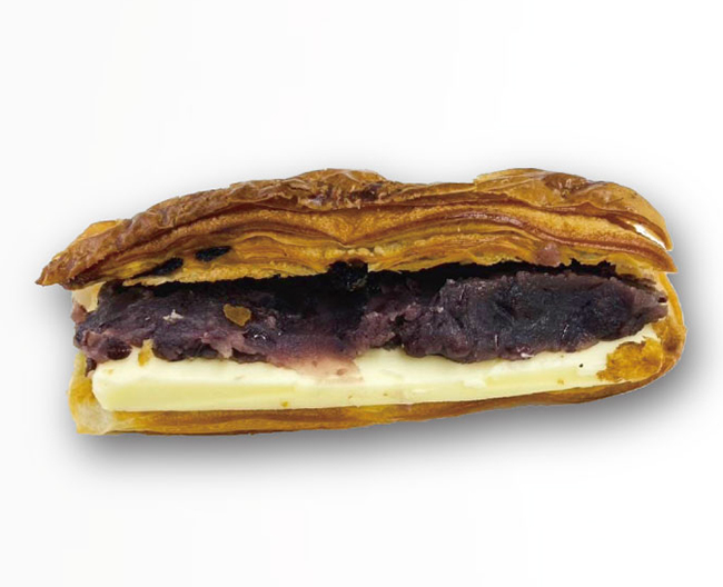 レーズンの入ったクロワッサン生地に、粒あんとよつ葉バターをサンドした贅沢なパンです。