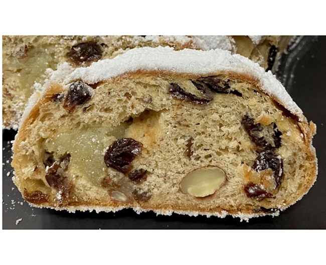 グラスフェッドバターをたっぷり使用した風味豊かなシュトレン。2種類のリキュールに漬け込んだフルーツ(レーズン、オレンジピール、チェリー、ドライアップル、ドライパイン)をたっぷり使用しリッチに仕上げました。バターとフルーツをたっぷり使用することで、しっとりとした味わいのあるシュトレンです。
