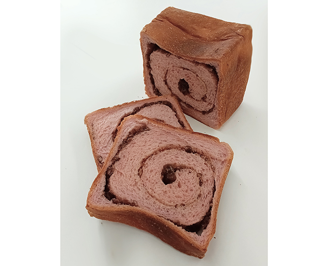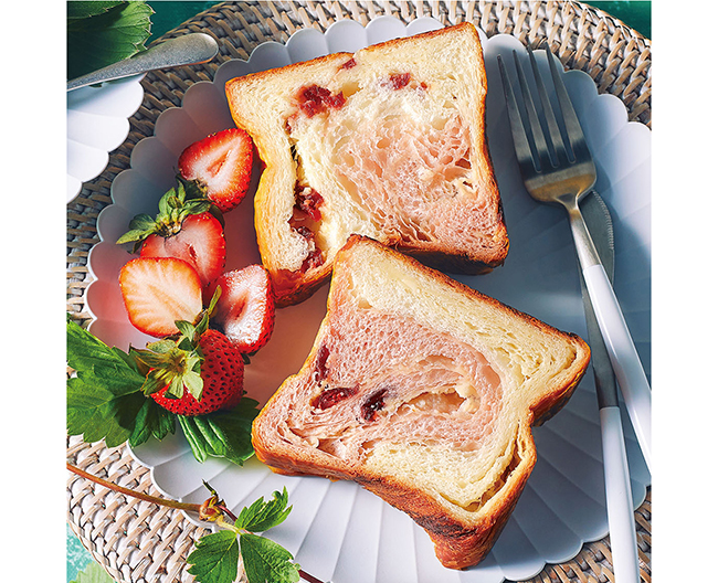 国産小麦「春よ恋」の生地に、いちご果汁を混ぜ、粒あんを巻き込んで焼き上げた食パンです。