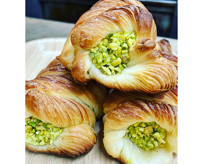 濃厚なピスタチオクリームが入ったデニッシュのコルネ、サイドにピスタチオをトッピングしました。