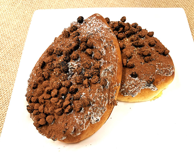 「あまおう」の苺クリームとレアクリームチーズ、ストロベリージュレを巻き込んで焼きあげ、フランボワーズチョコレートを掛けた、冷やしても美味しい当店看板商品のスウィーツ食パン。