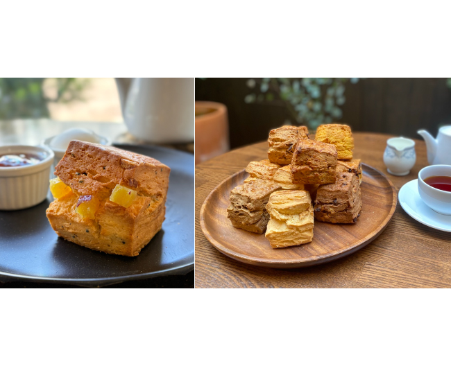 神戸岡本のバラ公園前にお店を構えるカフェ。人気のスコーンはバターと純生クリーム48%をたっぷり使用して焼きあげています。秋の味覚さつまいもの甘露煮と香ばしい黒ゴマを入れて焼きあげた高島屋大阪店限定のスコーンもご用意。