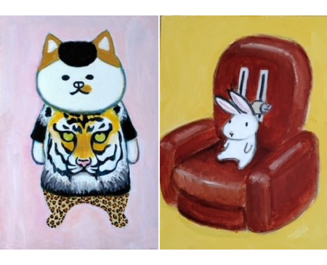 (左)「ニャニワ」(アクリルM12号) 264,000円/(右)「マッサージチェア②」(アクリル4号) 88,000円