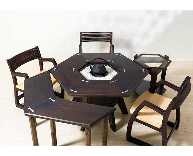 暖気式火鉢テーブルセット(桐材・クルミ材/テーブル:約幅121×奥行105×高さ67cm、V型サイドテーブル:約幅65×奥行105×高さ67cm、アームチェア3脚セット:約幅55×奥行52×高さ75cm〈シート高41cm〉) 1,413,500円/サイドテーブル(約幅58×奥行50×高さ61cm) 99,000円