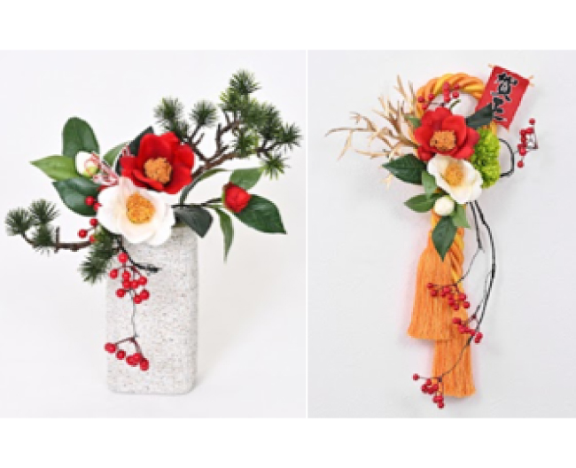 (写真右)椿迎春お飾り(ポリエステル ほか/約25×15×高さ45cm) 8,800円