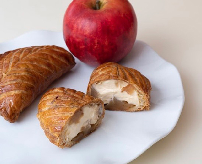 林檎を砂糖のみでキャラメリゼしパイで包み焼成、冷却後カスタードクリームをたっぷり詰めた、シュークリームのような冷たいアップルパイ。