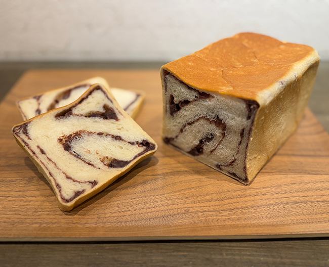 北海道産契約栽培小麦100%のはるきらりを使用した食パンに、北海道産特別栽培小豆を使用したあんこをマーブル状にたっぷり入れて焼きあげました。