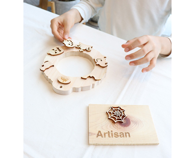 木製のリースに8種類のモチーフをお好きな場所に並べてシールやペンでデコレーション。オリジナルのハロウィンリースを作ります。