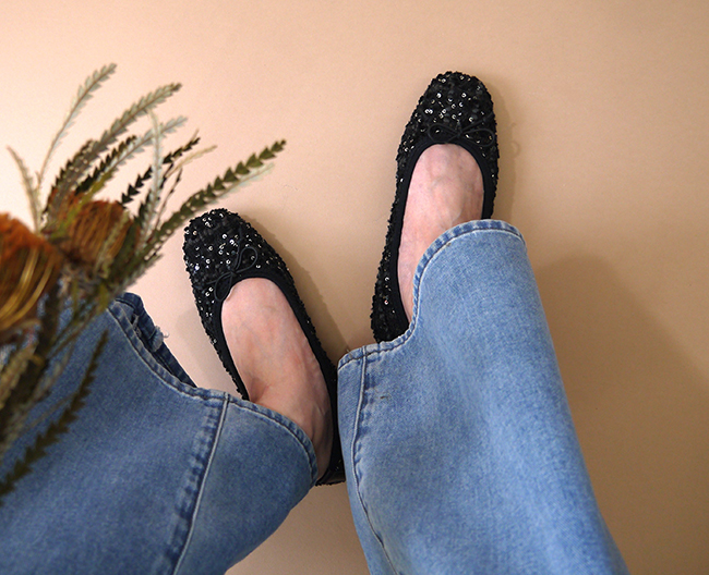 ↑キュートなキラキラツイード生地を使用したバレエシューズ。スパンコールがついており、特別感あふれる1足です。