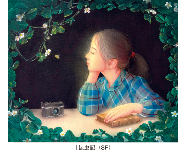 物語の中の印象的な言葉や、幼い頃の記憶をもとに、詩的かつノスタルジックなイメージを紡ぎ出す山口暁子先生。少女像、古書と小鳥、季節の花々など、絹本に表現されるその絵画世界は、観る側の遠い記憶をやさしく揺り起こし、幼き日の情景へと誘うことでしょう。