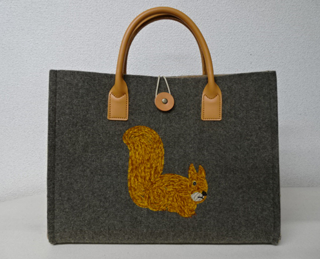 イタリア製ダブルフェースのフェルトを使用し、国内にてモールテープでリスの刺しゅうを施したトートバッグ。
