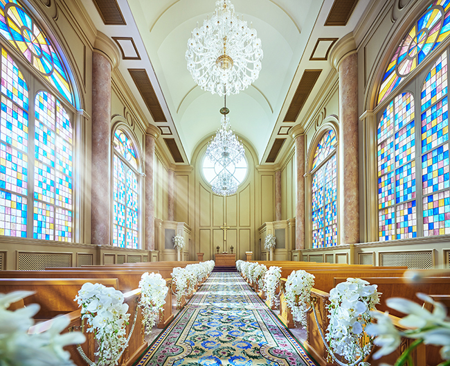 リーガロイヤルホテル大阪 ヴィニェット コレクションのウェディングで、みなさまに祝福されるおふたりの理想の結婚式を。格式だけを重んじるのではなく、結婚式の本質を大切にし続けること。91年の歴史だけを誇るのではなく、家族の絆を見つめ続けること。大阪の迎賓館として誕生したホテルだからこそ生み出せる、大切なゲストと心から笑顔になれる時間をお届けいたします。関西最大級の長いバージンロードと高い天井が特徴のチャペル。光を受けて幻想的な彩りをみせるステンドグラスや天井に連なるクリスタルシャンデリア、パイプオルガンの響きと聖歌隊の声に包まれて、神聖なる儀式が執り行われます。