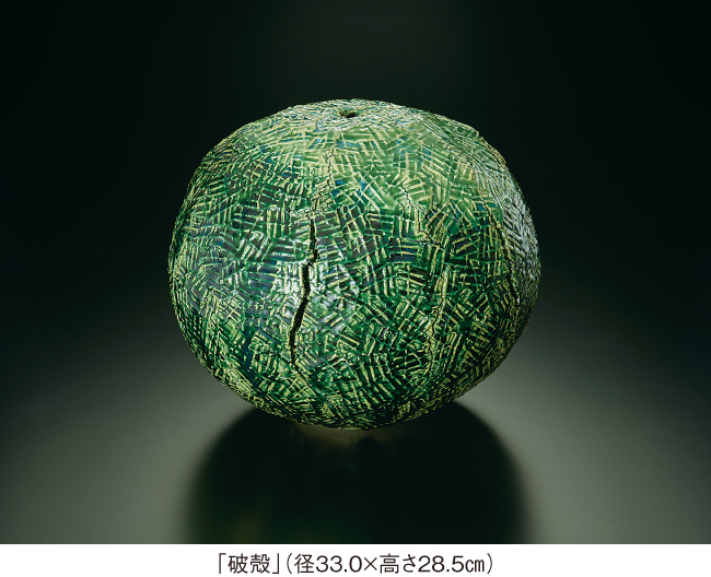 先生は1964年に岐阜県多治見市に生まれ、緑釉のグラデーション、櫛目や泥漿を施した力強い肌合いなど、伝統的な織部とは一線を画す、多様な緑の表現を切り拓いてきました。今展では、叩きの技法によって器体を膨らませる過程で自然に生じるヒビや亀裂を特徴とした「破殻」や、落ち葉から朽ち葉へと移ろう時間の変化を色彩で表現した「赤朽葉」の新シリーズを中心に、花器、壷、茶埦、皿などの新作を一堂に展観いたします。ぜひこの機会に、ご高覧くださいますようご案内申しあげます。