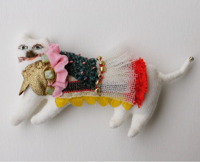人形作家IRIIRI さんの作ったヌードのネコ顔に刺しゅうと、ボディにビーズ・ハギレなどで装飾、ピンをつけたらブローチの完成。