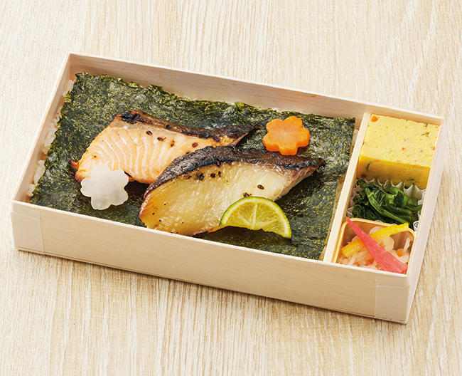 鮭と銀鱈を使った、紅白の海苔弁当を期間限定でどうぞ。