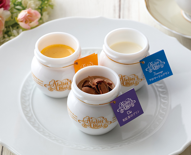 やわらかな甘みと繊細な香りの〈お茶の千代乃園〉の品種いずみを使用した「和紅茶のプリン」に「バニラのプリン」「フロマージュプリン」のセット。