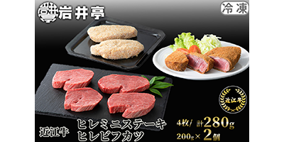- 岩井亭厳選の美しいサシが入った近江牛のヒレミニステーキと手作りヒレビフカツをセットにしました。ヒレは口の中でほどける贅沢なやわらかさをお楽しみいただけます。大変まろやかで芳醇な風味のビフカツは格別の一品です。