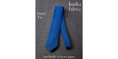 - 京都の北部、丹後地方で手織りのモノづくりを続ける〈Kuska fabric〉。300年前に始まる着物生地『丹後ちりめん』の生産が盛んな地域です。ガルザタイの特徴は独特の織り柄とニットタイのような柔らかさ。立体的な手織りが生み出すシルクの光沢が胸元を印象的に飾ります。〈Kuska fabric〉はすべて手織りのため、1人の職人が1日にネクタイ2~3本分しか織ることができない希少性があります。