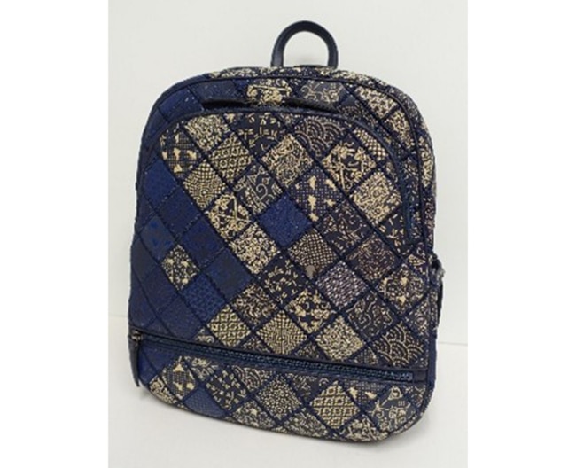 パッチワーク作品のため、色や柄の配置は一点一点異なります。A4サイズのファイルが入る大きさで、前側下部のポケットには傘入れを付けています。