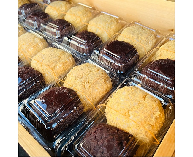 京都・伏見 巨椋池の田んぼで育てた自家栽培のもち米を使い、ひとつひとつ丁寧に仕上げました。素材の味を生かし、こだわり抜いた自家製粒あんは、甘さ控えめのあっさり仕上げ。