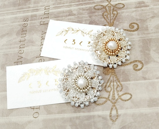 ラメ糸で編んだニャンドゥティレースにチェコビーズやパールをあしらったブローチ。