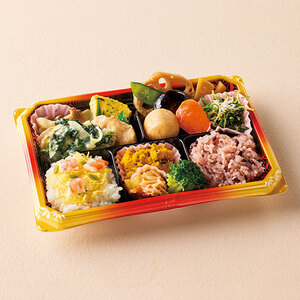 | 数・内容 | 1人前(ちらし寿司・黒米ご飯・煮物・鮭と野菜クリーム煮・しらす厚揚げピザ風焼・しめじとニューサマーオレンジのマリネ・鶏橙酢焼・かぼちゃサラダ・ひじきと三つ葉入玉子焼・しらす豆苗和え他) |