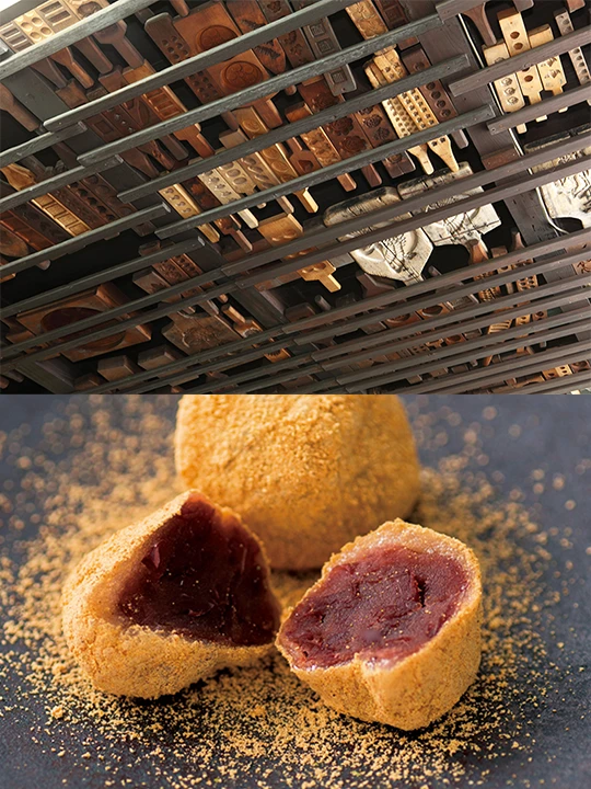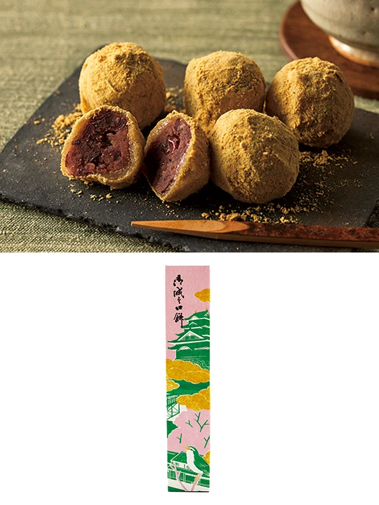 また〈本家菊屋〉は素材に妥協しません。「御城之口餅」は、国産青大豆のきな粉に近江産の餅米、十勝や丹波の大粒小豆などを合わせて仕立てたお菓子です。たっぷりとまぶされたきな粉は香ばしく、餅はとろけるような食感。主役となる餡のおいしさは、蒸気で一気に炊き上げて火にかける時間が短くした「砲金の大釜」で炊き上げているからこそ。