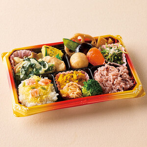 | 数・内容 | 1人前(ちらし寿司・黒米ご飯・煮物・鮭と野菜クリーム煮・しらす厚揚げピザ風焼・しめじとニューサマーオレンジのマリネ・鶏橙酢焼・かぼちゃサラダ・ひじきと三つ葉入玉子焼・しらす豆苗和え他) |