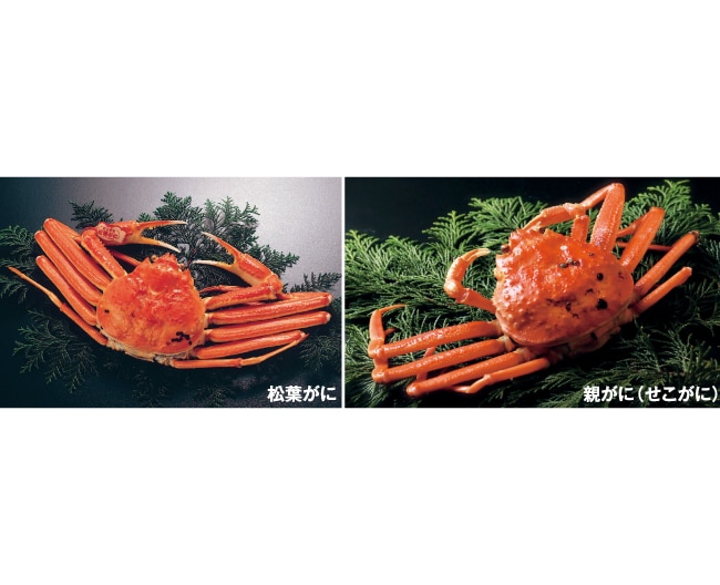「松葉ガニ」は鳥取県でのズワイガニのオスの呼び名。ぎっしり詰まった身の上質な甘みが魅力です。「親がに」は鳥取県でのズワイガニのメスの呼び名。濃厚な味わいの卵巣とカニみそがたっぷリ詰まっています。