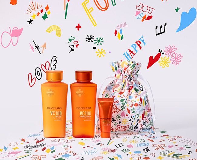 高浸透ビタミンC*1をマイクロカプセル化することで、素早い浸透*2を可能にした化粧水(現品)と、高浸透ビタミンC*1に2種のビタミンC*3をプラスしてうるおいとなめらかさを両立した乳液(現品)の、「VC100」ラインのスキンケアアイテム2点にとろける温感クレンジング、幅広い分野で活躍するイラストレーター SHOGO SEKINE氏とのコラボレーションによるオリジナル巾着をセット。