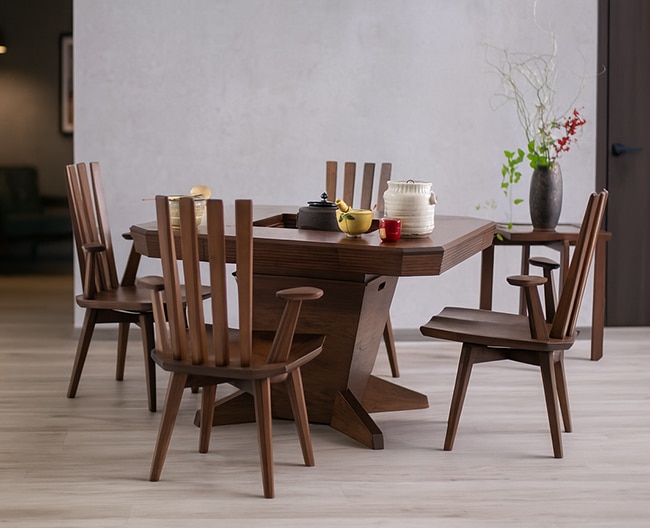 〈マルイ造形家具工業〉火鉢ダイニングセット(スピンチェア×4脚付)(オニグルミ材・ウレタンクリア/テーブル:約105×105×高さ69cm、椅子:約56×56×高さ85〈シート高さ40〉cm) 1,496,000円
