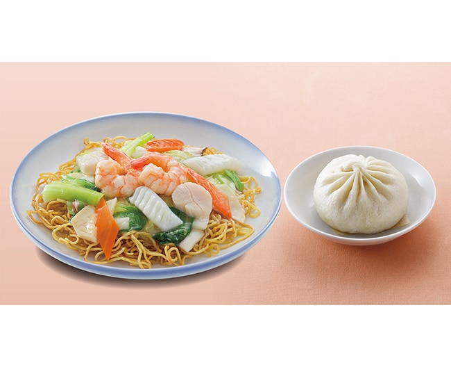 イートインで人気が高い海鮮焼きそばに、限定で豚まんをプラス。