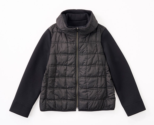 詰物に地球環境に配慮した再生ペットボトル中綿”ECO LINE(エコライン)”を使用したブルゾンです。地球環境に優しいだけでなく十分な保温・保湿性、軽さを持ってます。アーム部分に別布、キルト部分にスパンコールを使用してエレガントでカジュアルな雰囲気のデザインもポイントです。
