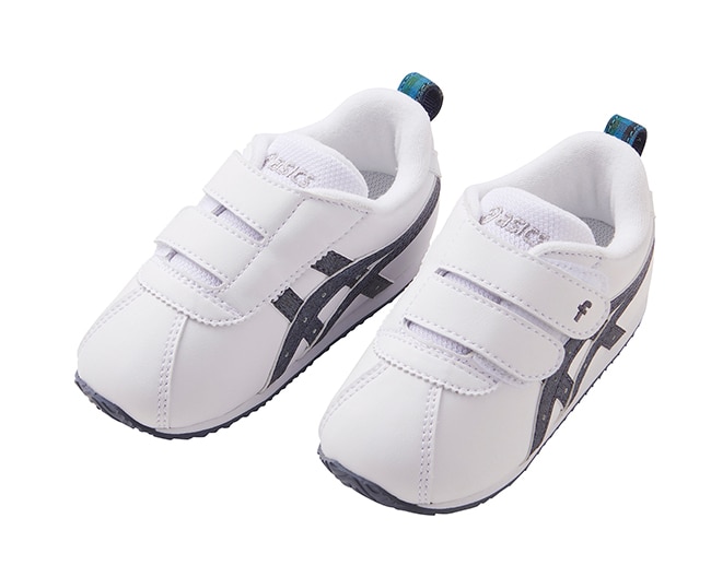 アシックスの人気モデル「COTLA(コトラ)」のベビーコラボ企画。SUKU2シリーズは、ベットボトル由来の再生ポリエステルを積極的に商品に採用し、CO2排出量の削減に貢献しています。側面のアシックスマークはダンガリー生地調にプリントし、かかとつまみには青系ファミリアチェックのテープを使用しています。男女間わずスタイリングに取り入れやすいカラーです。