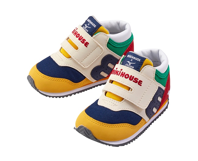 おこさまの足の成長を大切に考えた「ミキハウス×ミズノ」のコラボレーションアイテムは、デザインと機能性を兼備したシューズ。主素材の合成皮革とメッシュには、再生ポリエステルをベースとした環境に配慮した素材を使用しています。