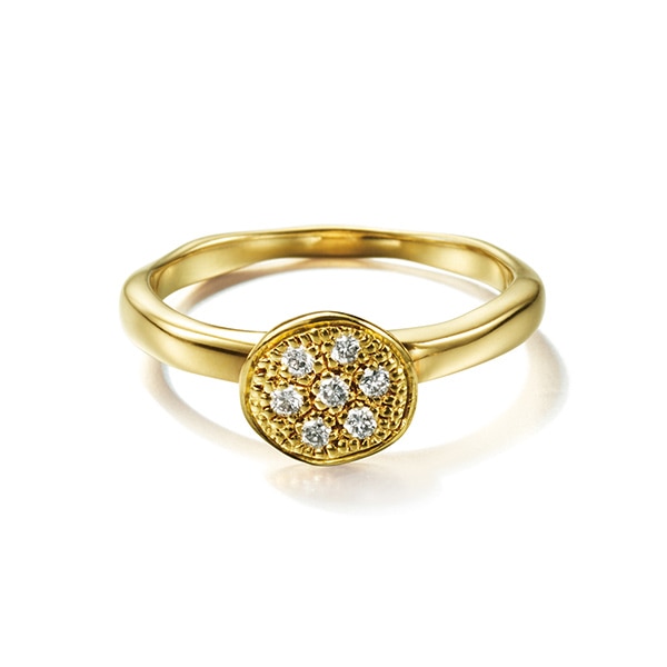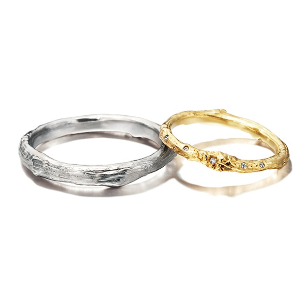 自然からインスピレーションを受けて、樹木の細い枝の絶妙な質感、節目をとらえたリング。レディスには10粒のダイヤモンドをランダムに配して朝露のようなピュアな煌めきを讃える。