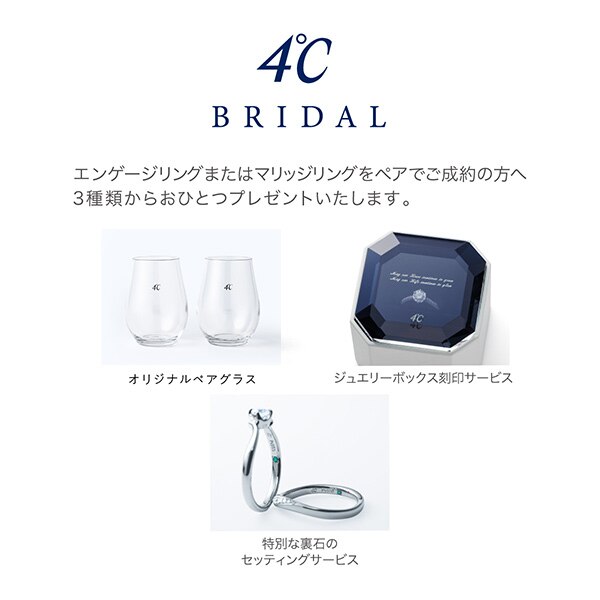 エンゲージリングまたはマリッジリングをペアでご成約のお客様に、3種類のギフトからおひとつをさしあげます。