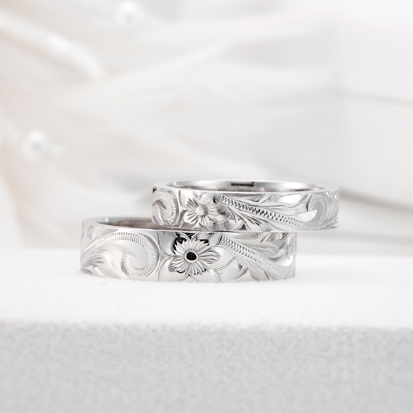 ハワイでは“幸せを運んでくる“と言われる波のデザインと、”身に着けることで自然災害から身を守る”という意味合いのあるプルメリアの花をあしらったマリッジリング。