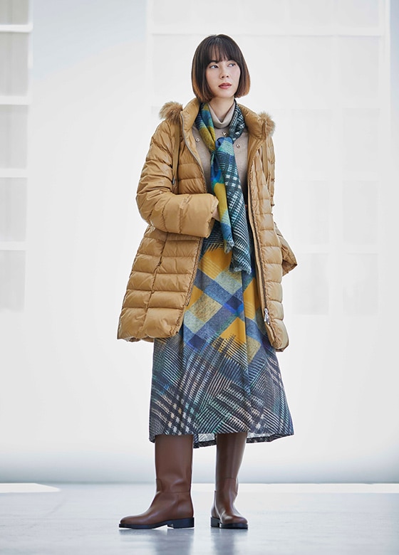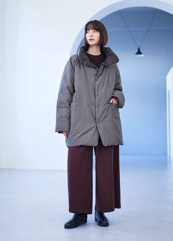 肌触りのよいシルクコットンを使ったダウンコート。片面を細やかなチェック柄で仕立てることでスタイリッシュに。