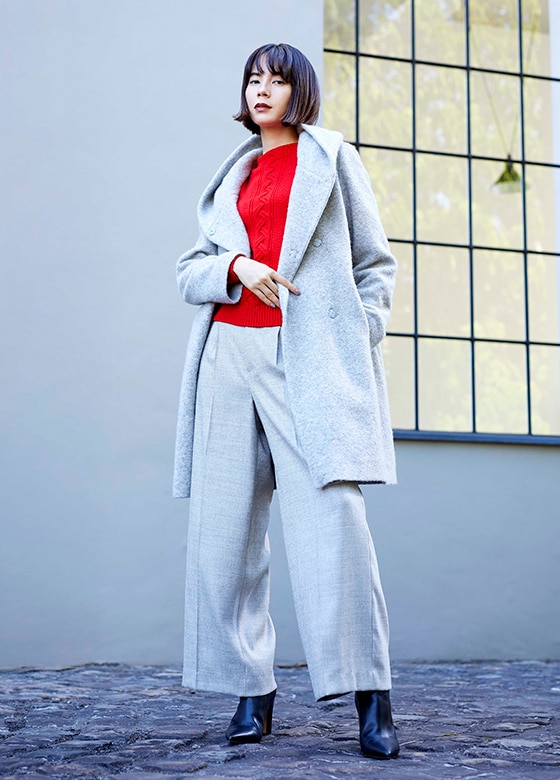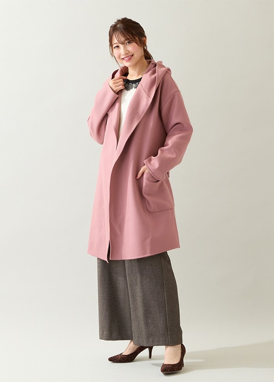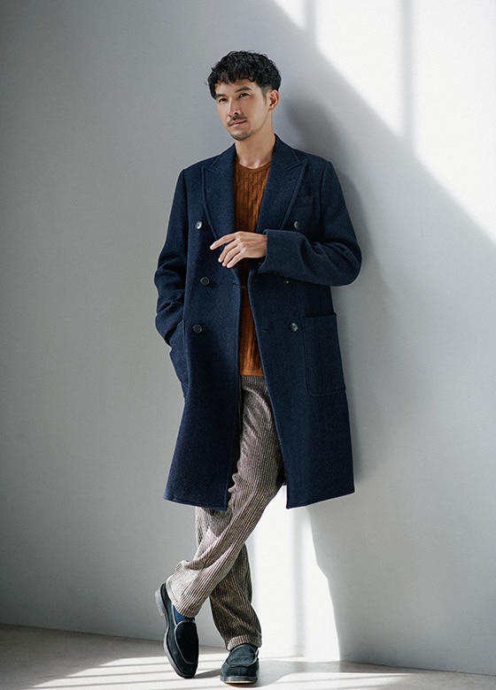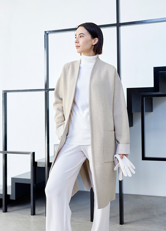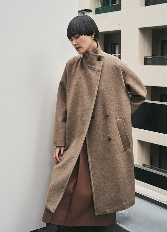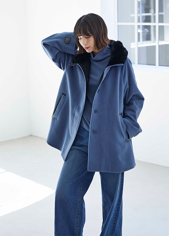 折りたためるフードで首元まであたたかなダブルブレストのコート。身体をつつみこんでくれる贅沢な着心地も魅力。