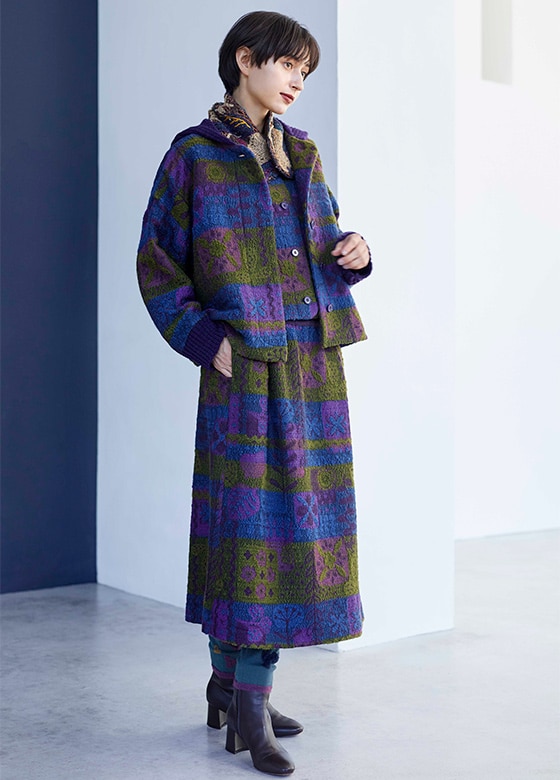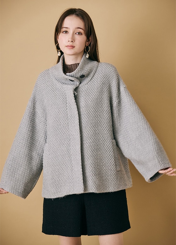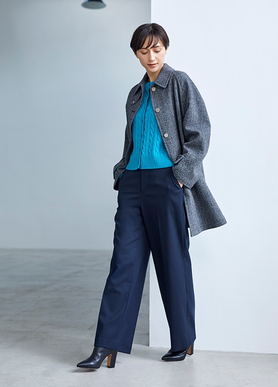 ケープのようなフォルムとゆとりのある袖が特徴。表情のあるヘリンボン、裏地は吸湿発熱機能のある繊維を織りこみました。