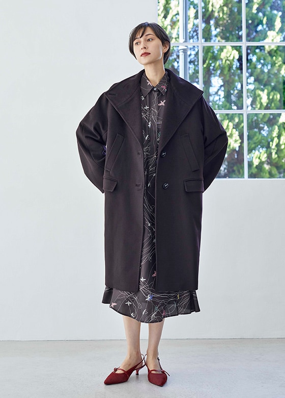 表面を程よく毛羽立たせた光沢を出したジベリン加工の1着。ビッグショルダーがエレガント。