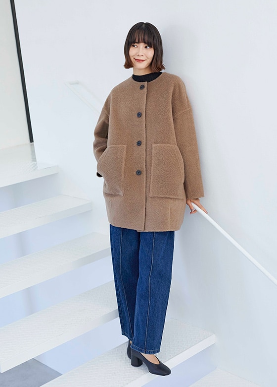 表地はボア素材、裏地はウール見えの合繊素材で、リバーシブルで活躍するノーカラーコート。
